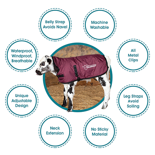 Introducing the Thermoo Calf Jacket- a premium design. Manufactured in durable materials; waterproof, rip-stop outer layer, belly strap, smooth lining, metal clips and 200g polyfill. Support for newborns, weak, sick, & cold calves. Waterproof & machine washable.