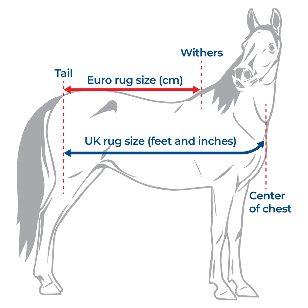 If you are buying a rug in European sizing, you'll need to take the measurement from the horse's withers, across their back to the top of their tail, in centimetres. This will give you the rug size you need, or you can take the same measurement as above and use the conversion chart below to find the right size.